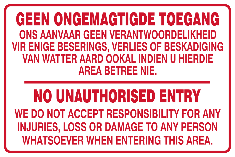 No Unauthorised Entry safety sign is to inform patrons that owner of property will not accept responsibility for any injuries, loss or damage to any person whatsoever when entering this area.