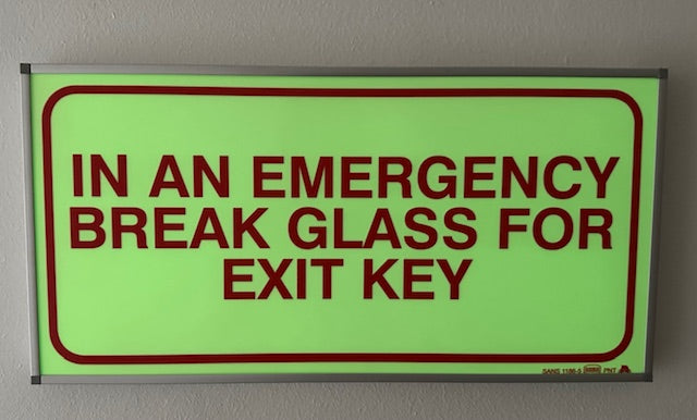 Stay prepared with the SABS In an Emergency Break Glass for Exit Key photoluminescent sign (F43). Designed to glow in the dark, this sign ensures critical safety information is visible even in power outages or low-light conditions. Its photoluminescent properties allow it to absorb and store light, providing clear guidance when you need it most. Compliant with SABS standards, it guarantees quality and reliability for emergency situations. Install this sign near emergency exit keys to help occupants quickly locate and use them during an urgent evacuation, enhancing overall safety and peace of mind.