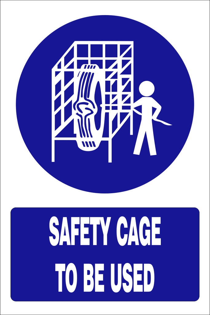 Safety sign gives instruction that a safety cage needs to be used in a designated area.