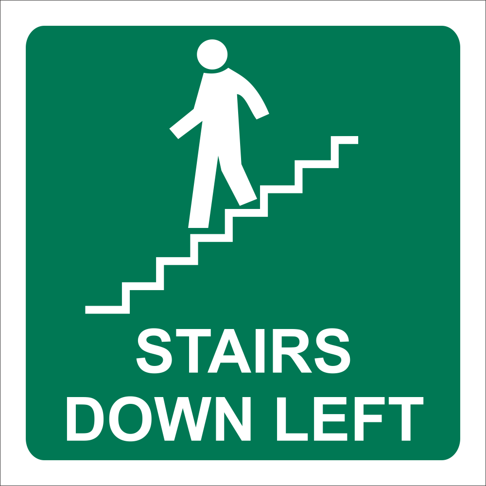 Stairs Going Down (Left) (GA17A) safety sign has a symbol of a man walking down stairs to the left on the green square shaped safety sign.