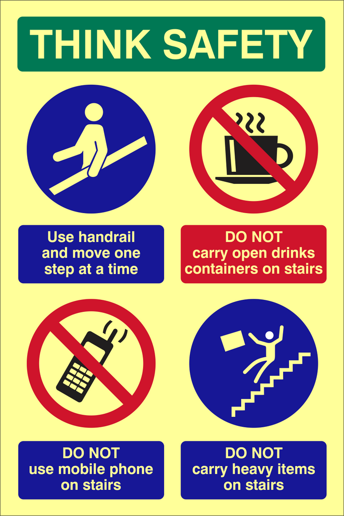 Prioritize safety by using the handrail and taking one step at a time. This essential safety sign also reminds you to avoid carrying open drinks, using mobile phones, or carrying heavy objects while on the stairs, helping to prevent accidents and ensure a secure environment.